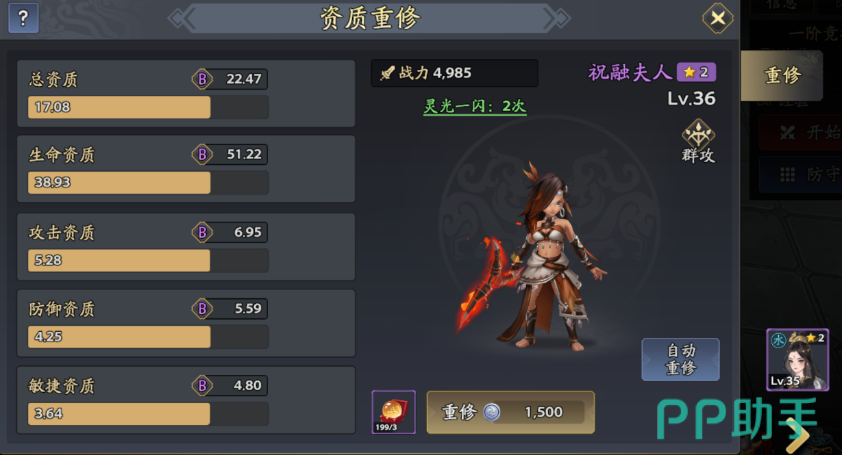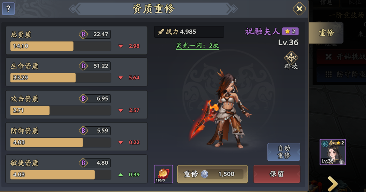 每次重修将随机提升四项资质中的若干项数值,重修结果即时显示。若新资质组合符合预期,玩家可确认保留;若未达理想效果,则可选择放弃本次重修,但已消耗的银币与武将重修丹不可返还。因此建议提前储备充足资源,并优先应用于高潜力、长期主力培养的武将身上,避免资源错配。