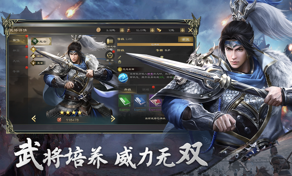 RPG元素深度融合的动作割草作品,引入神兽助战系统,可提升武将基础属性并附加特殊战场效果。新武将按月度版本更新,保持内容新鲜度;培养体系涵盖等级、星级、神兵、坐骑、心法五大模块,成长曲线平滑且目标明确。战斗场景支持多角度运镜,无双技演出兼具电影感与操作反馈。