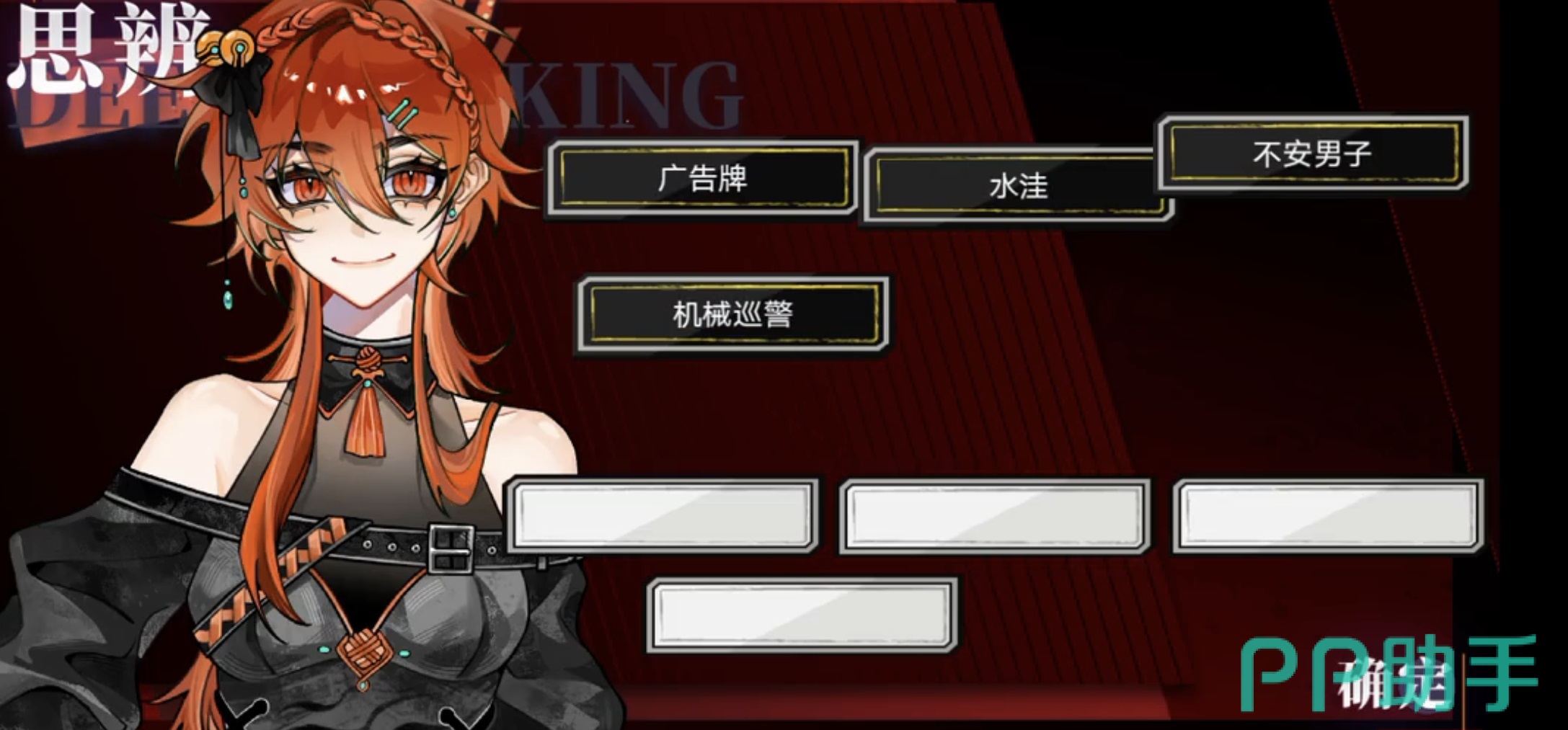 真正构成第一关难点的是思辨解谜系统。该环节要求玩家将已获得的线索卡牌拖入三个横向格位。常见误区是默认三格必须全部填满,但正确解法为:左侧格位放置“广告牌”,中间格位放置“不安男子”,右侧格位严格保持空白——不可放置任何元素,且顺序不可调换。此设计强调对线索逻辑关系的判断力,而非堆叠数量。