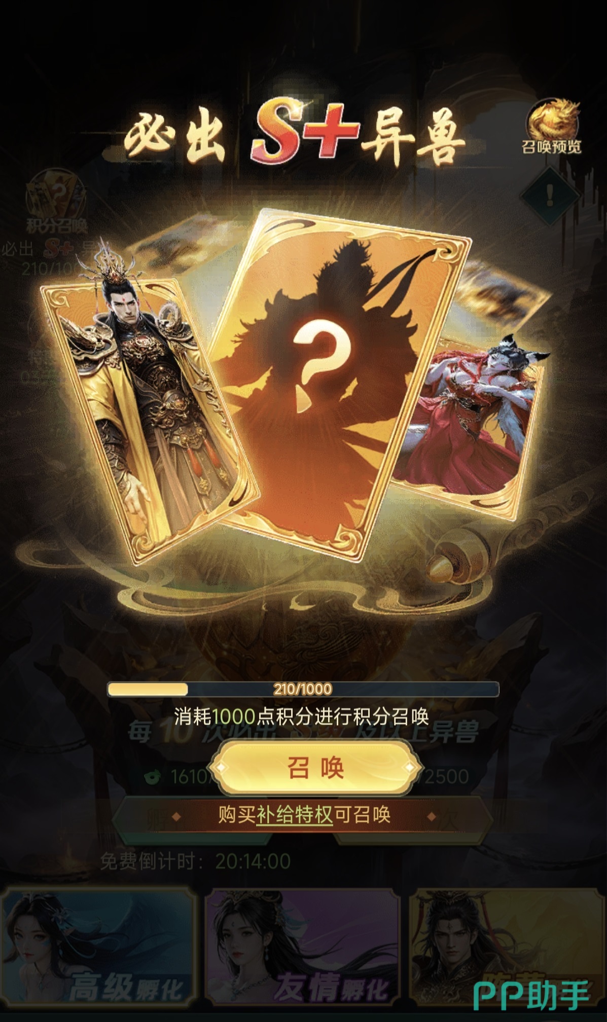 日常使用频率最高的为高级孵化池与阵营孵化池。除保底外,每次高级孵化可累积10点积分,友情孵化则获2点积分。这些积分可用于“积分召唤”,是获取S+级异兽的专属通道;开启补给特权后,积分将自动转化为召唤次数,助力玩家高效锁定稀有神兽。概率分布方面,高级孵化中三星异兽出现率为80%,四星为15%,五星为5%;友情孵化五星出率仅为1%,实际培养价值有限,建议优先投入高级孵化资源。阵营孵化不设独立概率加成,但对已确定主力阵容的玩家而言,能显著提升对应阵营核心角色的获取效率。