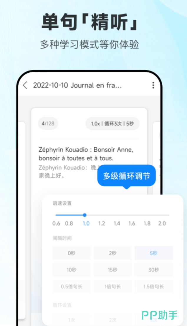 听力这件事,光靠泛听效果有限,精听才是真正提升的方式。资源库里有法语媒体资讯、经典教材音频、备考素材,还有实时法语电台,内容覆盖面广。语速可以分8档调节,听写测验和单句精听能帮人把发音细节抠清楚,跟读打分功能对口语练习也有帮助。查词窗口和法语助手打通了,长按生词直接出释义,还会标注阴阳性,不用来回切换软件。