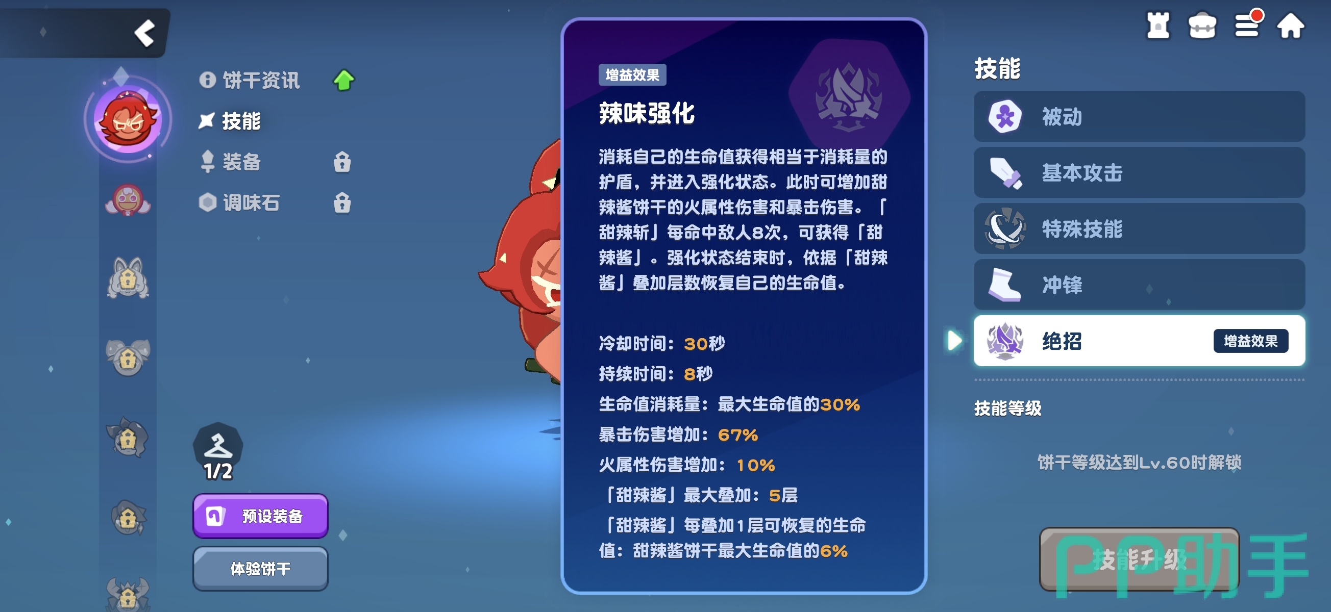 在队伍构建层面,建议搭配具备稳定治疗能力的辅助型饼干人。由于“辣味强化”会主动扣除生命值,因此需确保角色在强化期结束后仍能存活并完成技能结算。桃子饼干是理想搭档之一:同属火属性,且拥有生成桃子包子的能力,可持续为全队回复生命值,有效增强队伍续航能力,与甜辣酱饼干形成良好协同效应。