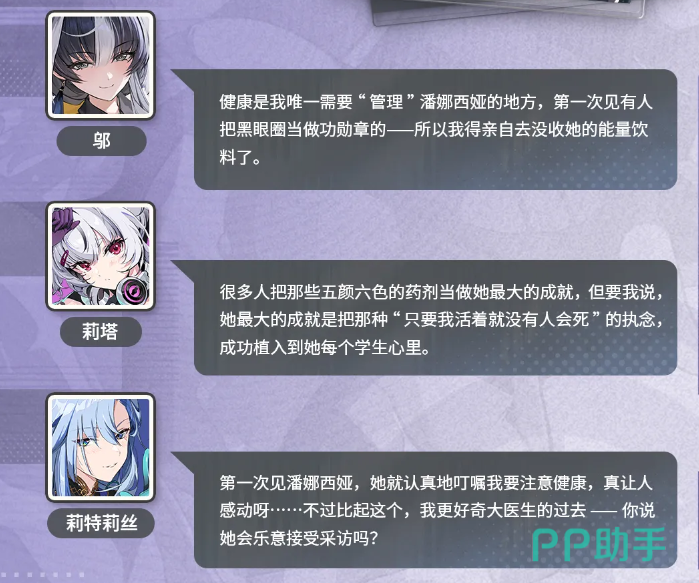 关于潘娜西娅的过往经历与心理动因,游戏并未通过主线直接披露。玩家对其认知主要来源于其他角色的侧面转述——零散的对话片段、任务日志中的备注、终端数据库里的权限记录……这些碎片共同构建出一个沉默却厚重的形象:她主动剥离个人生活边界,将全部意志锚定于文明存续这一终极目标之上。这种极致的奉献型人格,在当前主流二次元角色谱系中实属稀缺,也成为驱动玩家深入探索剧情的重要动因。