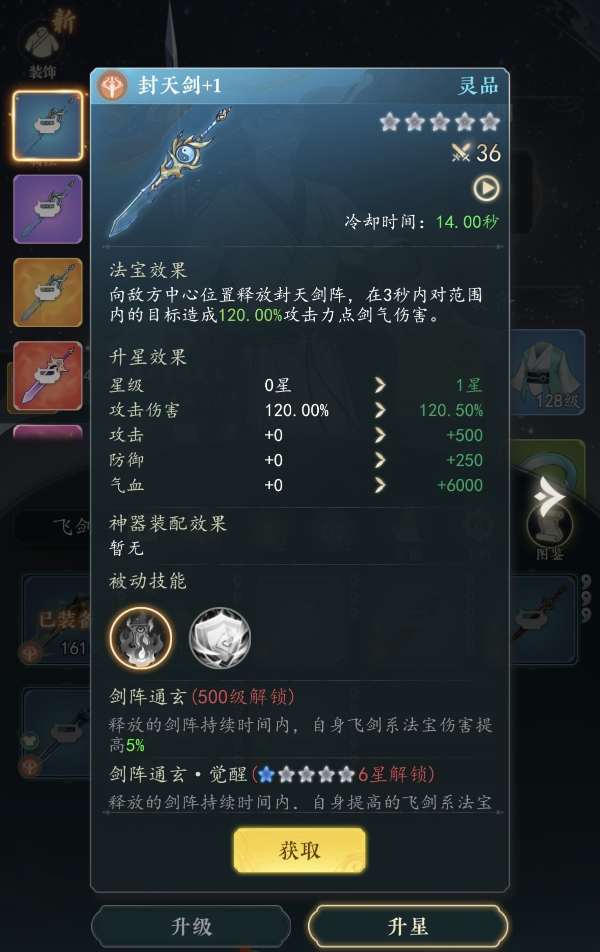 纯飞剑流的基础配置为:封天剑、诛仙剑、青云剑、绝仙剑、戮仙剑、天罡剑。六件均为飞剑类法宝,最大化强化剑系协同效果。具体机制如下——诛仙剑具备突进+三段挥砍能力,附带高额剑气伤害;绝仙剑可发射多道仙剑进行扇形打击;封天剑落地生成持续3秒的剑阵,期间对范围内敌人造成持续伤害,并提升自身所有飞剑法宝的伤害;戮仙剑分裂为三柄飞剑直线穿刺,对路径目标造成巨额伤害,附带击退与剑意状态;青云剑与天罡剑则分别提供额外暴击加成与攻速增益,共同构成一套节奏紧凑、压制力强的输出体系。此配置适合快速推进主线剧情或挑战高层数试炼塔,但缺乏控制与生存向功能。