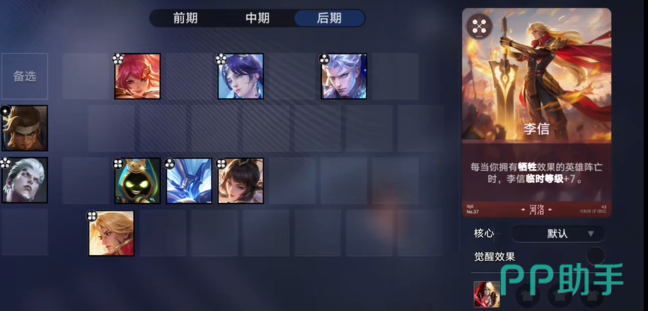 在最后的阶段,可以选择一些具有坦克效果的英雄,但是在后期的英雄选择上相对来说还是比较自由的,只要血量充足就能够搭配李信和阿离一起躺赢。后期选择的选手们可以安排在前排进行扛伤,如果遇到无法招架的伤害时,李信和阿离再上场。