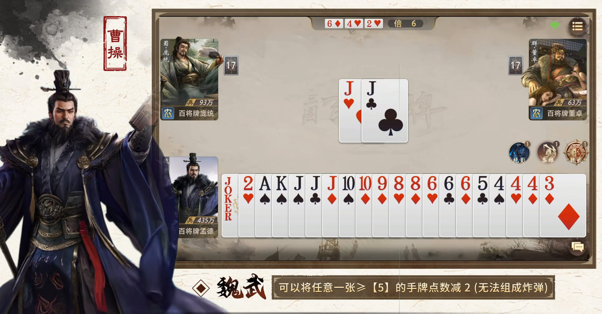 游戏的核心玩法就是以卡牌为基础展开的,然后将三国不同武将的特殊技能融入到快速对局之中。而且每一局的游戏时长都很短,基本上三分钟左右就可以打完一局,这对于碎片化玩家们来说是非常不错的选择。游戏的基本规则也是非常容易掌握的,就像斗地主一样,玩家需要将自己的手牌全部出完就算胜利。在出牌的过程中,玩家可以运动武将们的技能来改变牌型,尽力将牌往自己的理想牌型上靠。比如大家熟悉的关羽,他的技能就是可以获得一张万能牌,或者是从别的玩家手里拿一张牌,这样的技能让玩家在凑顺子和连对时会更加灵活。