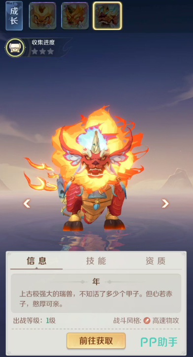 第二个大家可以玩的是年,年他在自身外观上面看起来就是传统故事当中代表祥瑞的神兽,自身技能效果一般是针对单体进行输出,而且突破了之后可以带来的基础伤害都有155%,而且在年的身上如果大家看得到速度优势的话,后期的追加攻击是可以很快释放出来的,这里追加的攻击当中也有95%的伤害,如果是两次连击的话,其实他在其中还可以造成更高的群体能力,使用的场景当中,年可以用到的补刀伤害是比较多类型的。