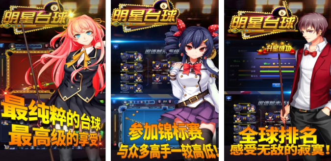 欢迎各位台球明星进入本作参与形形色色的斯诺克比赛,很纯正好玩的台球比赛玩法让许多台球高手沉迷,高精度的建模和音画效果都是玩家的最爱,拥有多人联机的排行榜模式可以轻松参与,锦标赛以及斯诺克这些好玩的模式更是随时进入,游戏角色具有二次元俊美的风格看上去也是栩栩如生哟。