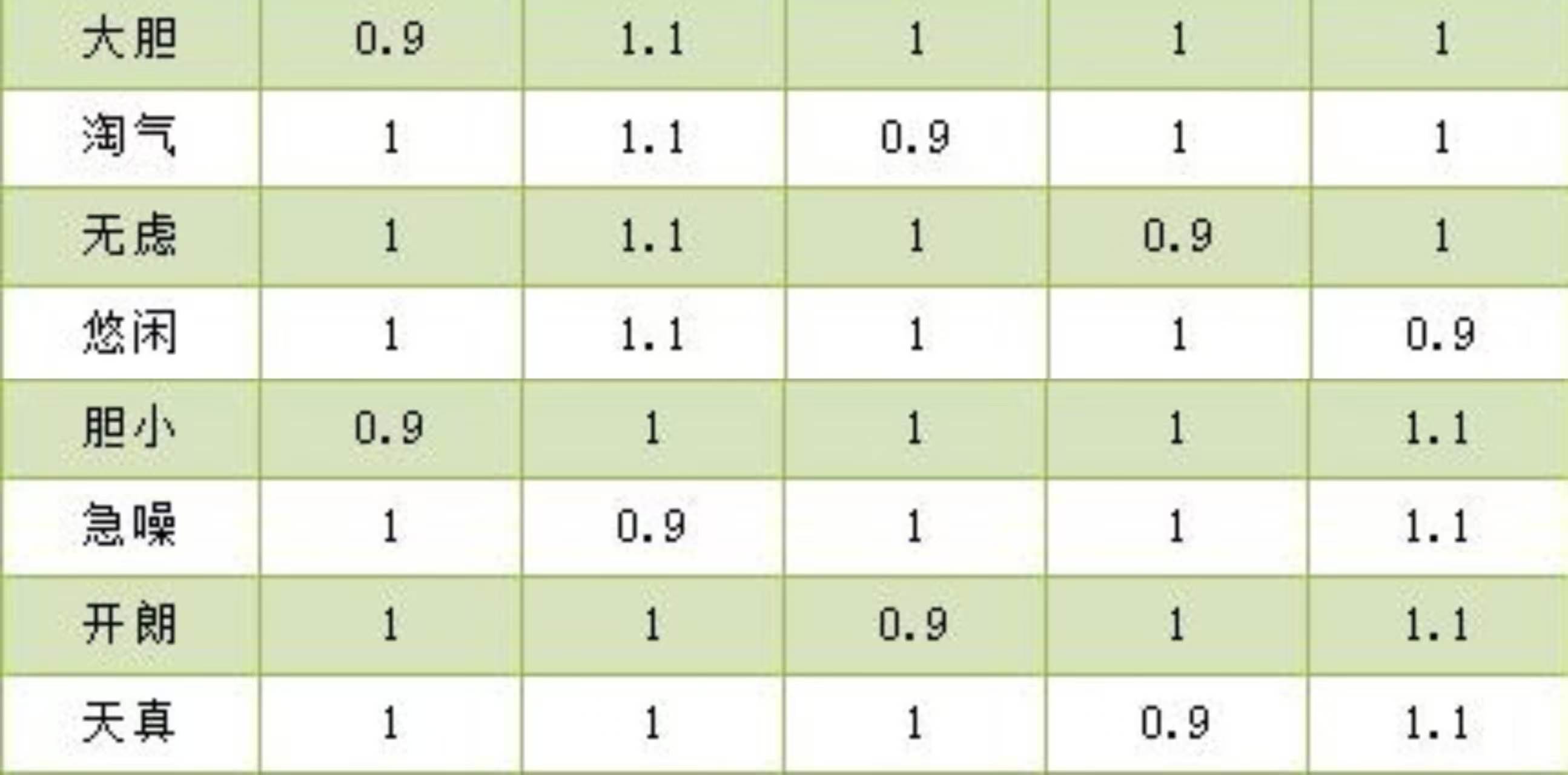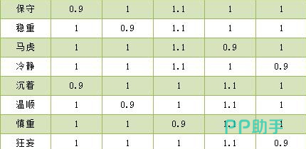 第4个主加魔攻的性格则为保守、稳重,冷静和马虎。同样都是增加10%的攻击,所损失的属性分别就有10%的物理攻击,物理防御,速度和魔法抗性;第5个加的就是魔抗的性格。可选择的性格培养有沉着、狂妄,慎重和温顺,增加的魔抗属性有10%,同样,减少的分别为10%的物理攻击、速度、魔法攻击和物理防御;最后一个就是比较平衡的性格,这种基本上既没有加成,同样它也没有削减,它的各方面基础属性都是默认的增长比例,例如认真平衡等这一类,也都是属于平衡性格。不会有任何属性增减。