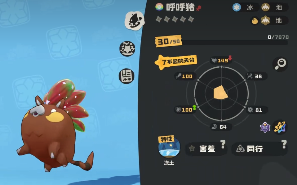 说到属性方面,呼呼猪的魔法防御和生命值是比较突出的两个点。这两项数值在同等级精灵里面不算低,打起来比较抗揍。攻击力这块确实不是它的强项,数值上看起来中规中矩。不过这并不影响它在战斗中的发挥,因为它有一个很有意思的特性——携带冰属性技能的时候,地属性技能的威力会跟着提升。这个联动效果用好了,输出会比单纯堆攻击力要强不少。