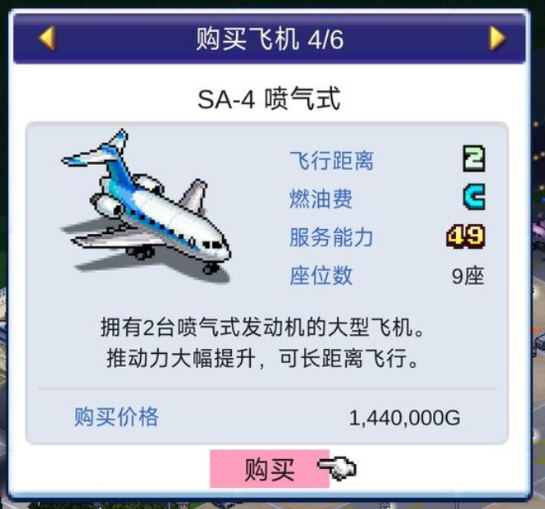 第四个为大家介绍的是SA轻羽飞机,这是目前游戏当中大家可以开发的一类新机型,它的优势就是具有很强的舒适性,而且也是一类强化之后的科技,内部空间是非常大的,而且整体的乘客满意程度也会比较高,其中的座椅布局都是经过升级的,所以对于旅客的满意度来说是比较容易获取更高分数的,当然了,它的单次运输燃油费比较贵,所以要看大家在这里设定的是什么样,在整体门票的设定上面可能需要的金额也比较高,飞行距离相对来说没有那么远,所以大家可以多安排几次航线。