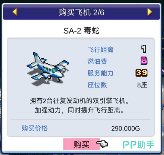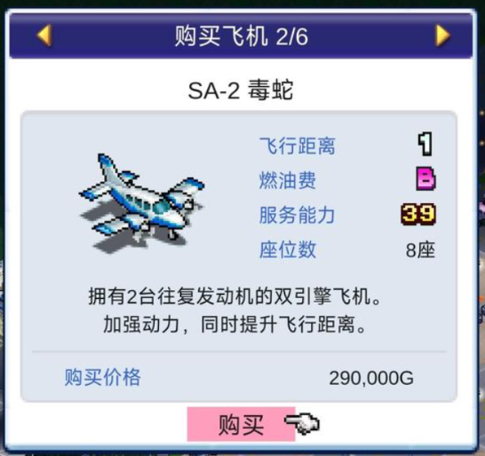 另外就是一个长续航的机型,叫做SA毒蛇,这个飞机作为一个性能比较高的机型,其实航程是非常远的,而且它有一个优势,就是燃油费只达到B级,这里最大航程的话,跟它的续航速度一般来说都是利用双引擎的,可以达到目前此类飞机当中的最高水准的,所以在跨区域的航线当中,一般很多玩家都会设定它为主要的机型,拥有两台往复发动机的话,在加动了自身动力同时它飞行距离也是非常远,一些长线航线大家都可以用。