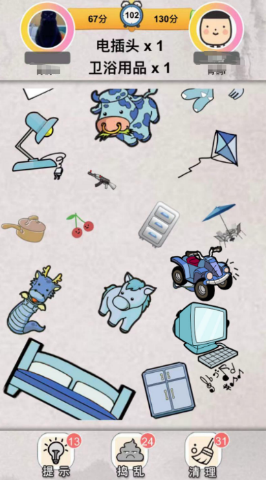 较为出色的pk的游戏,与我们比较熟悉的找你妹较为相似,在进入关卡之后,关卡会提示相应的道具,玩家要在杂乱无章的环境当中寻找,找到与提示对应的物品即可,每次寻找物品之后都可以添加时长,可与全球玩家共同pk对战,互相比拼,约上好友完成较量,看一看谁的眼神更好。