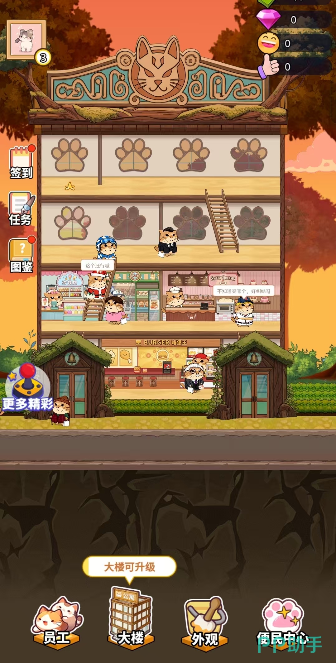 在猫猫世界中,一栋充满店铺的高楼悄然开业,快来瞧瞧吧!玩家作为楼盘主人可以对大楼进行简单的装修,进而开始各个店铺的布置与打理。首先,玩家将开第一所店铺,也就是冷饮店进行生意上资金的赚取,接着再利用资金对大楼进行等级的提升和下一个店铺的开业。但随着生意的火爆,玩家还需要保持店铺的干净才能吸引更多客人。
