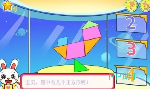 在丰富的数学知识总和之下,能够让孩子们对数学感兴趣,每个关卡中所提出的问题是完全不同的。大家可以结合自己的喜好从中挑选,就比如在一张精美的图片中将会有不同形状组合在一起,形成了栩栩如生的画面,但是关卡会提问到。图中有几个正方形,对于很多小宝宝来说,通过仔细数数的方式就能够寻找到正确答案。