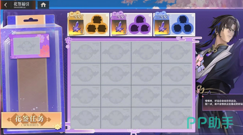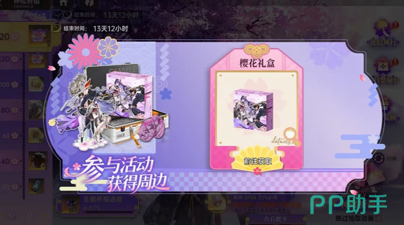 第二阶段「花签福引」以任务驱动为核心。玩家通过完成日常活跃任务积累进度,每完成一轮任务可领取「随机刮刮乐礼包」,开启后将获得不同稀有度的「神樱花签」刮刮卡。刮卡规则采用经典三连匹配机制:刮出三个相同图案即可兑换对应档位奖励。此外,达成全部活动成就还可额外领取「神樱御守」,进一步扩充祈福资源池,为最终阶段做好准备。