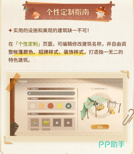 建筑升级是深化玩法体验的关键环节。满足条件后(如摆放指定配方家具并投入经营收益),即可启动升级流程。升级成功后,建筑基础收益提升,并解锁多项增益:库存容量上限提高、个性定制权限开放、专属道具奖励发放等。在「个性定制」界面中,玩家可自由修改建筑名称,调整帐篷主色调、招牌样式及装饰风格,实现高度个性化的视觉表达。