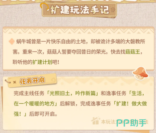 解锁扩建功能需完成前置条件:首先推进主线任务「光照旧土,吟作新篇」,随后完成逸事任务「生活,在一个暖暖的地方」,最终达成任务「扩建!做大做强!」,扩建入口方可激活。开启后,前往蜗牛城与菇菇王对话,听取其规划构想,即标志着扩建流程正式启动。
