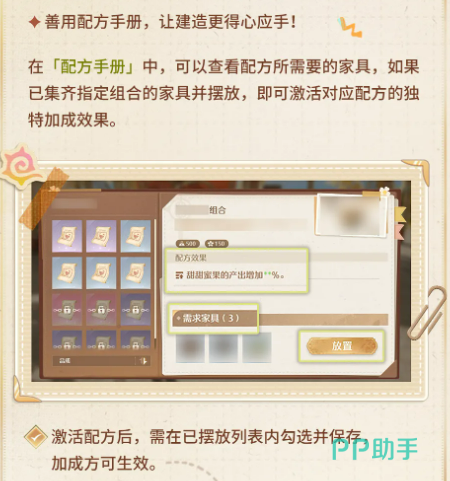 配方系统是提升运营效率的核心模块。玩家可在「配方手册」中查阅每套配方所需的家具清单。当所有对应家具均被正确摆放至建筑内,该配方加成即处于待激活状态。此时需进入「已摆放列表」手动勾选并保存,加成效果方能生效。需注意:单个建筑同时生效的配方数量存在上限,该上限随建筑等级提升而逐步增加。若某套配方尚缺部分家具,点击「追踪」按钮,缺失材料将自动同步至「家居制作台·扩建」的追踪列表,便于后续集中补全。