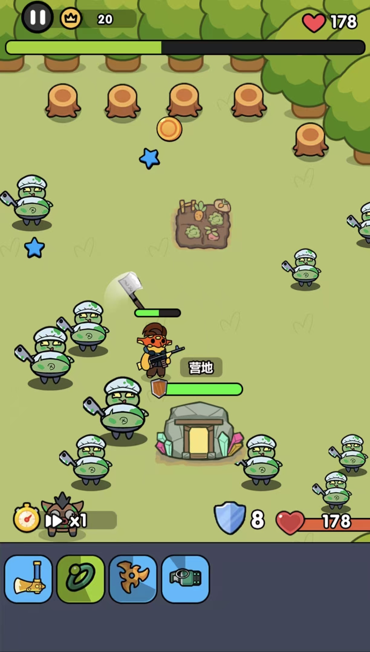 《砍树幸存者》作为一个末日的幸存者,白天需要在这里不断的进行砍树,在晚上的时候会有很多的怪物出席。通过砍树获得的资源进行建造,有可能获得其中的宝藏,获得的物资都会放到背包中,玩家可以利用各种武器装备对抗怪物。可以不断的升级自己的营地,打造更坚固的防御能力,还有非常多的技能能够组合使用,能体验到一些肉鸽元素。