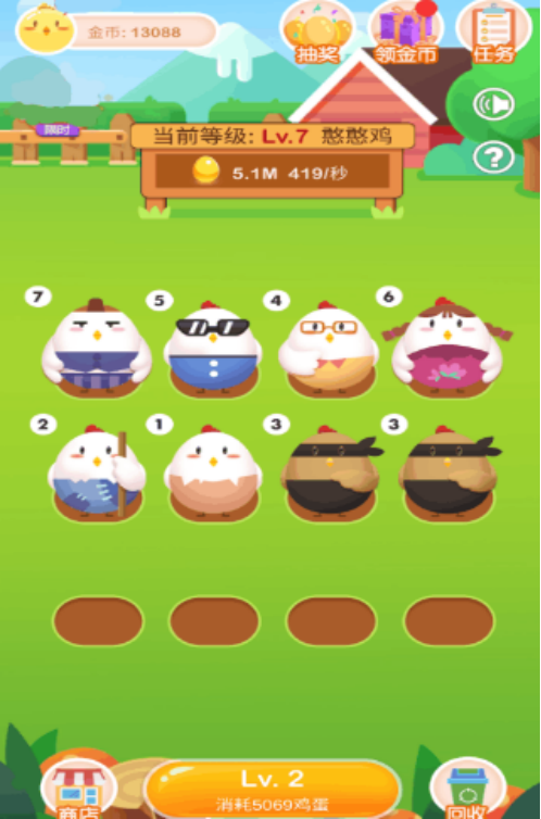 极易上手的操作方式也主打的就是合成的玩法,在关卡开始之后,将会呈现出很多等级比较低的小鸡,而每种鸡的外观形态或者是头上所展现的数量都完全不同,大家通过合理滑动的方式,将两个相同等级或者两个外观相同的小鸡放置在一起之后,就可以合成更高等级的小鸡类型,每次合成之后都可以获得相应的分数。