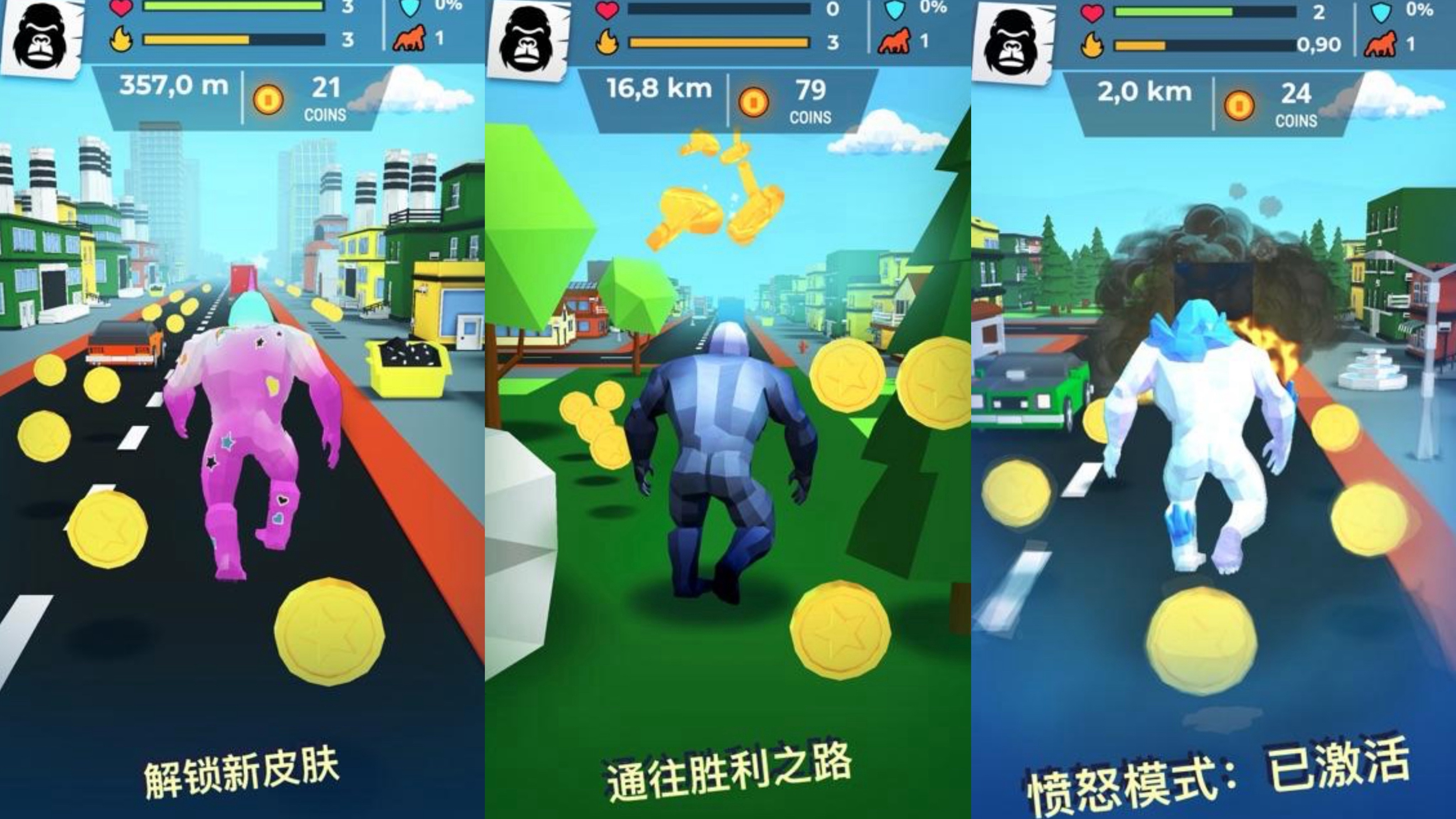 这是一款以大猩猩为主角的跑酷休闲类手游,游戏的主题是破坏,我们将化身为愤怒的大猩猩,去摧毁城市里那些高大的建筑群。同时游戏还会出现攻击我们的猎人和坦克,我们需要击败他们获取更高的积分。另外,游戏自由程度非常高,而且画面简洁,大家快去下载游戏体验吧!
