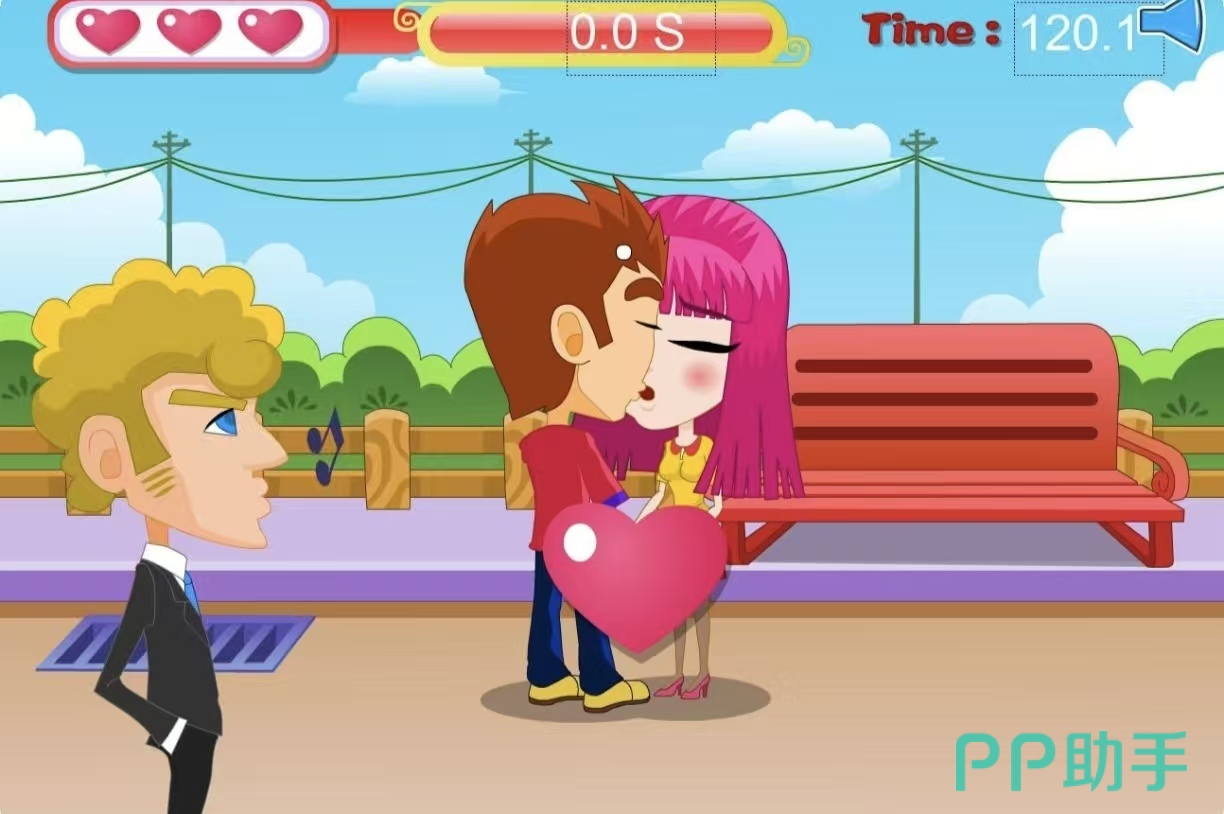 本作以轻松诙谐的卡通风格呈现约会场景,玩家需在限定时间内协助角色完成接吻挑战。关卡分布于公园、教室等多元地点,每关设有三颗爱心,代表三次操作容错机会。通过点击环境中的不同交互点,触发对应动作,考验反应力与策略判断。倒计时机制强化紧张感,带来节奏明快的游戏体验。
