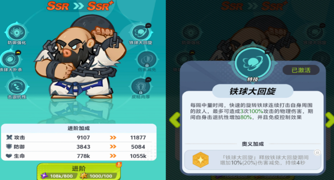 陈国汉是开荒期前排首选。其定位兼具持续输出与高生存能力,基础生命值突出,自带减伤机制,在承伤与反打两端均表现出色。必杀技具备强控+位移双重效果,可将目标撞击至墙体触发高额伤害;技能空档期依赖天赋“铁球大回旋”,连续三次范围物理攻击,释放期间免疫控制且提升击退抵抗,综合容错率极高,资源投入产出比显著优于同类角色。
