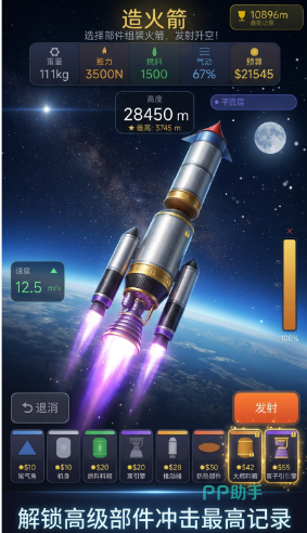 初次进入游戏,玩家会被丰富的零件选项所迷惑,但是这也是游戏的乐趣。不同的零件组合会导致完全不一样的飞行效果,轻量化设计让火箭飞得更高,增加动力的组合使得火箭速度更快,稳定的部件在风力、气流的影响下可以保持平衡。经过不断的尝试,你会慢慢找到最适合自己的火箭搭配方式,在挑战中积累经验,提高策略意识。每次的发射都是考验设计能力的“试金石”,也是智慧与勇气的较量。