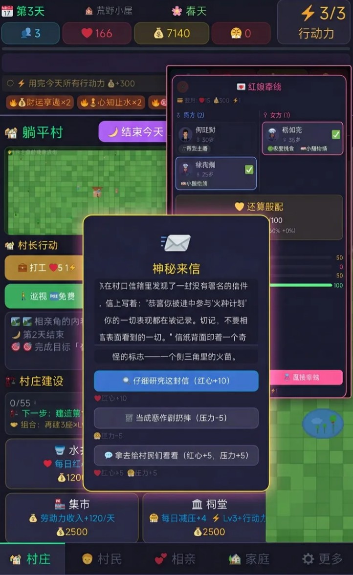 而作为村长,小伙伴们在管理村庄的时候,不管是主动卷还是躺平都是可以的,没有体力的限制,也没有任务的倒计时,每天可以自由的分配自己的行动力,可以消耗行动力去建房子,也可以安排村民去相亲,甚至什么都不做也是可以的,让村民们自由发展,毕竟这是躺平村呐。