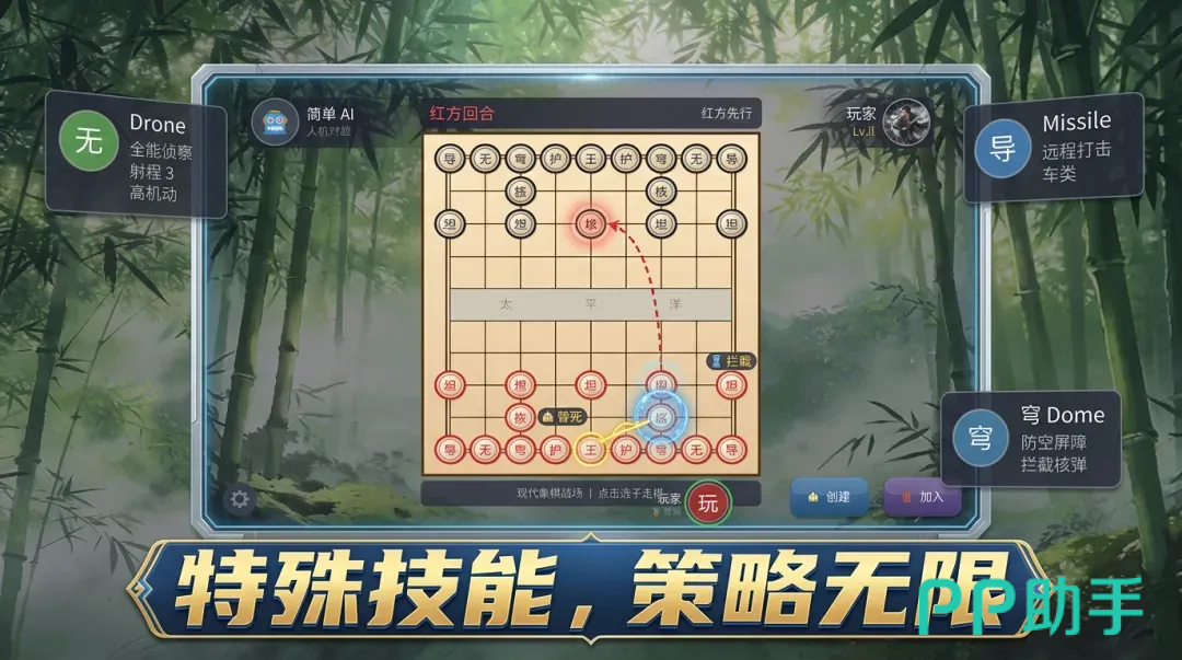 游戏采用标准中国象棋棋盘与胜负判定逻辑,但对棋子能力进行了深度重构。所有单位均配备独立技能树,释放时伴随动态视觉特效,显著增强操作反馈与沉浸感。匹配机制支持实时在线随机组队,玩家可随时接入跨服对局,挑战不同风格的对手,提升实战应变能力。
