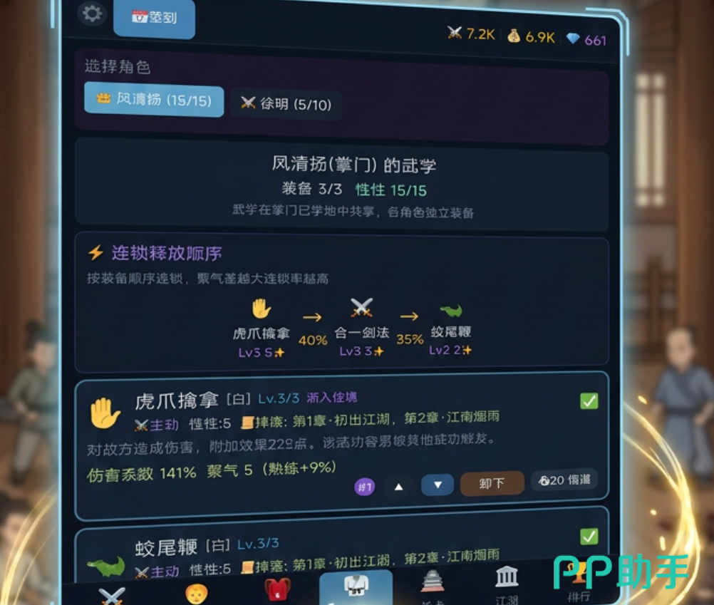 战斗采用半自动模式,玩家可实时切换已习得的三组武学组合。当识别到敌方释放特定类型技能(如毒功、幻术或爆发型连招)时,主动调用对应克制武学,即可显著削弱其效果,甚至逆转战局。该机制大幅强化战术选择权重,避免纯数值碾压,让每一场对决都兼具策略张力与操作反馈。