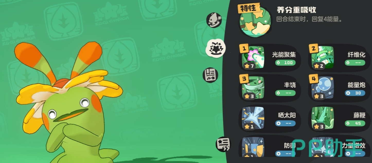 拥有稳定的能量回复与技能强化循环:“重吸收”在回合结束时恢复3点能量,首领化后提升至7点;“纤维化”提供70%减伤并附带伤害,“光线聚集”每次使用草系技能后威力永久+60;若预判对手将换宠(如地面系、水系克制单位),可灵活启用“丰饶强化”进行战术应对。