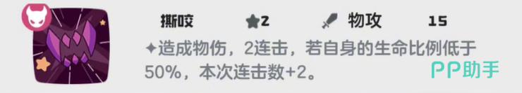 最后是撕咬,这个技能平时是2连击,但有个条件触发:当自身生命比例低于50%的时候,连击次数会变成4连击。这就是为什么生命个体值要培养好,生命高的话,撑到触发条件的机会更大,输出爆发也更稳。