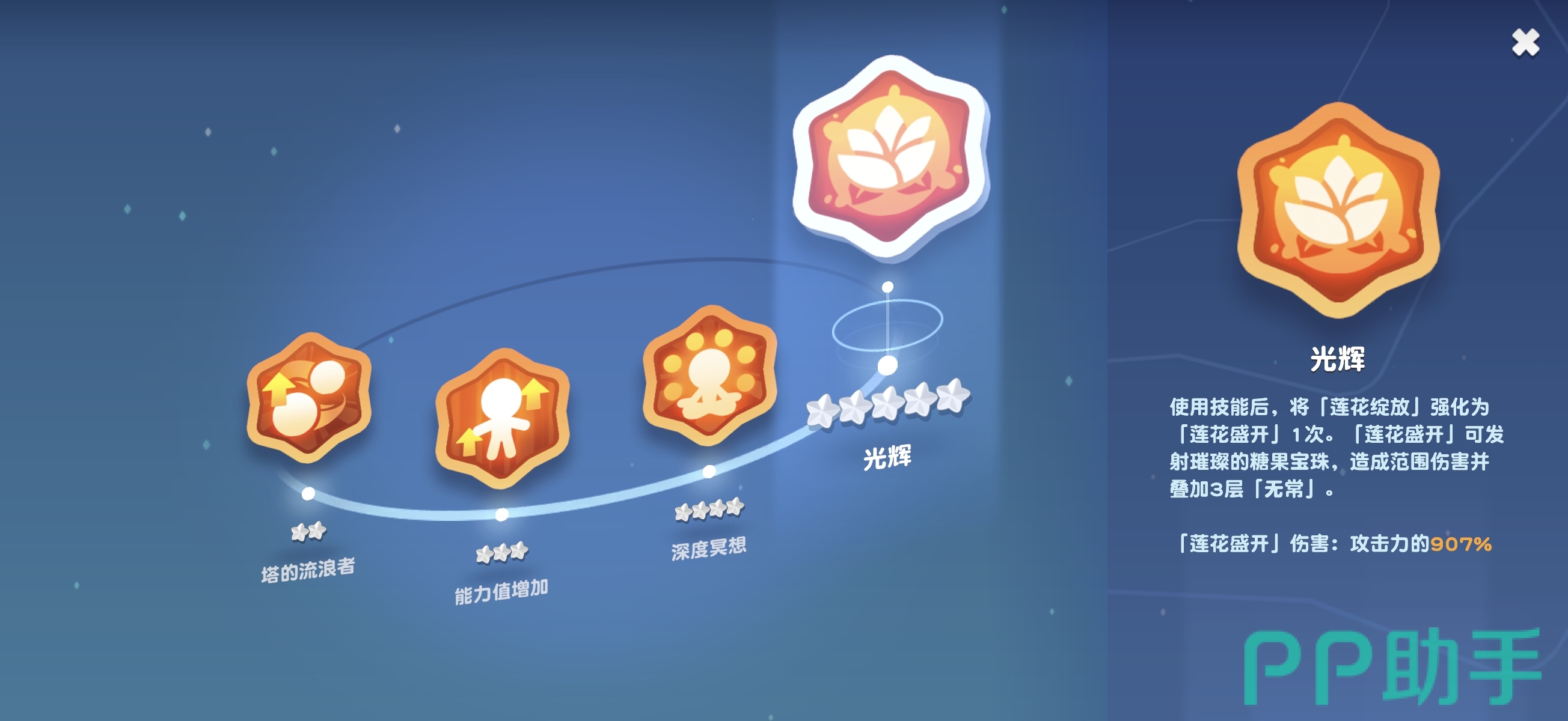 实战中需注重技能衔接节奏:优先通过普攻叠满“烦恼印记”,再衔接特殊技能或绝招以最大化增益收益。星级提升带来质变——升至五星后,“莲花绽放”技能进化为“莲花盛开”,不仅伤害增强,更可直接赋予目标3层“无常”效果,大幅缩短减防启动时间,在高强度PVP及BOSS战中具备战略级优势。