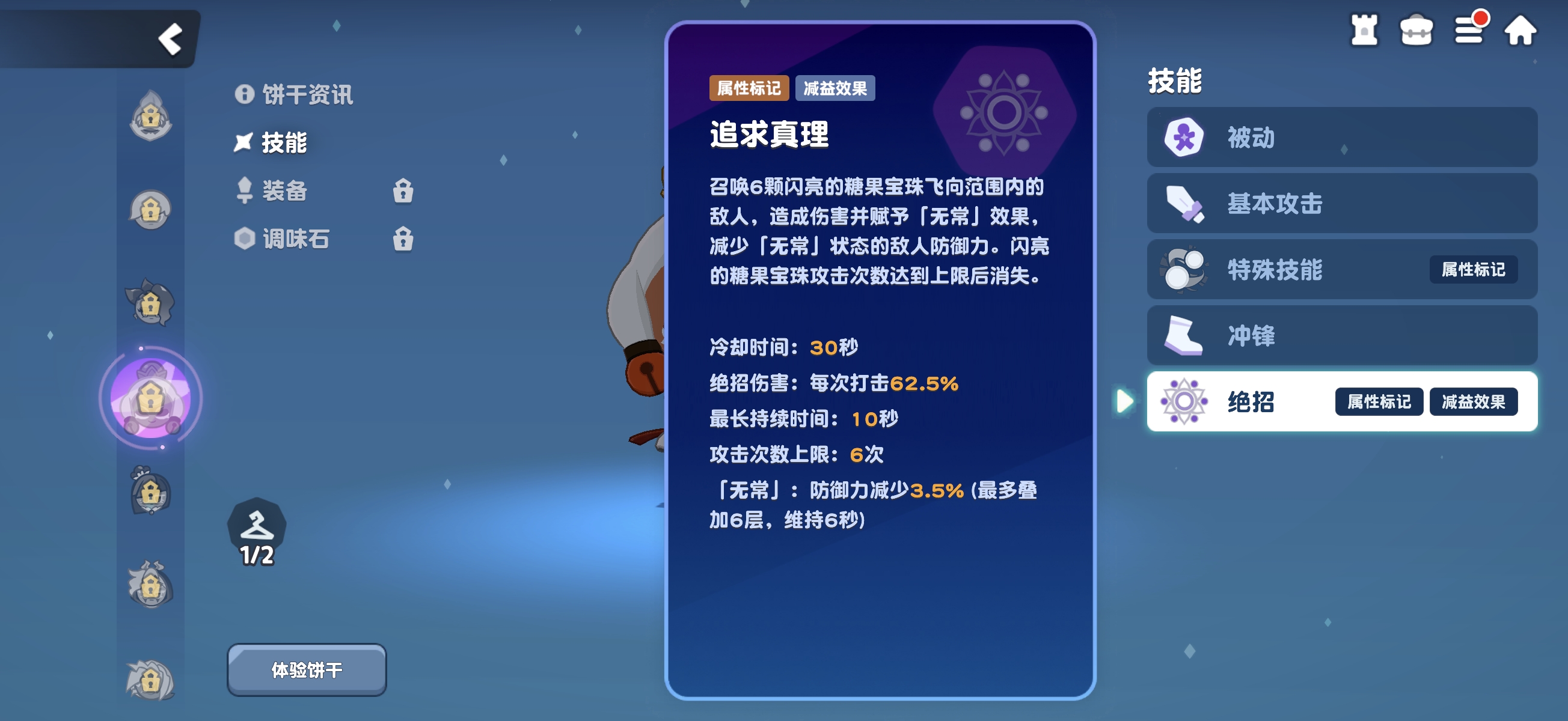 其被动技能“烦恼印记”具有高覆盖率:每次普攻命中目标即叠加1层,最多可叠加至5层。当目标携带该状态时,糖果球饼干释放的特殊技能与绝招均获得显著伤害提升。普通攻击为投射糖果宝珠,长按进入蓄力模式后可实现多段连发,兼顾压制与控场需求。特殊技能生成持续3.8秒的范围伤害区域,适用于地形限制场景,提升命中稳定性。绝招“缤纷宝珠阵”召唤6颗糖果宝珠对范围内敌人造成伤害,并施加“无常”减防效果——每层降低目标3.5%防御,最高叠加6层,持续6秒。满层减防幅度达21%,为全队输出创造关键窗口期。