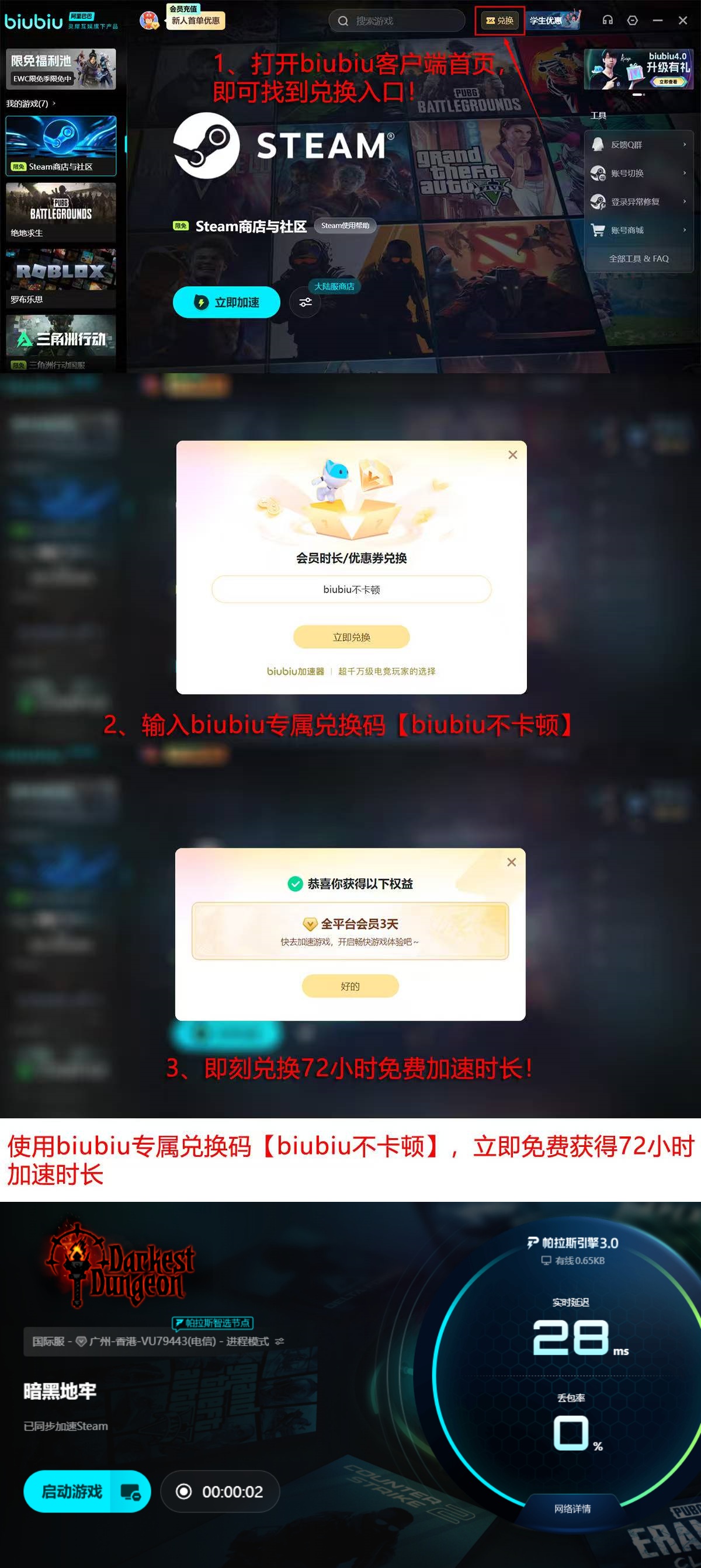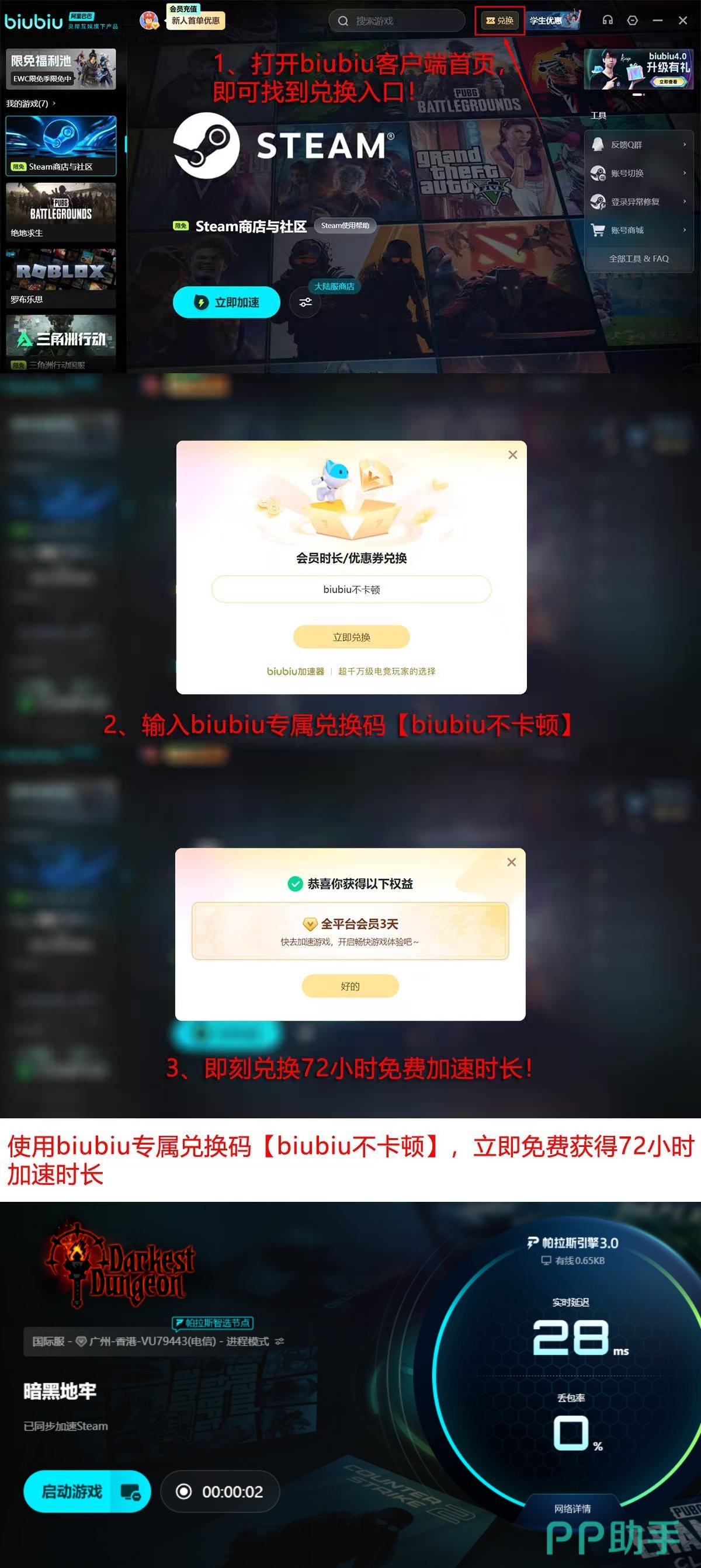 为确保实际场景适配性,产品团队特邀职业电竞选手左梓轩担任技术体验官,参与涵盖高并发、低带宽、跨区域路由切换等复杂条件的实机压力测试。新用户注册后可立即启用首日24小时全功能免费试用权限;完成注册后输入激活码“biubiu不卡顿”,还可额外获得72小时无限制加速服务,覆盖完整新手引导至深层副本挑战周期。
