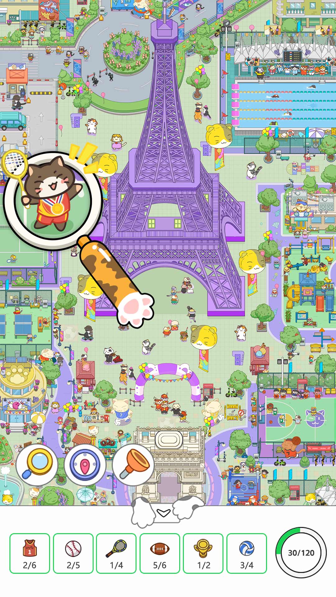治愈系解谜类手游,核心玩法为在七类主题场景(含城市街角、森林秘境、星空庭院等)中依清单定位隐藏物品。操作包含视角旋转、画面缩放、障碍解除及物件位移等轻度交互。每只出场猫咪均设定独立视觉特征与背景故事线,通关对应章节后解锁专属叙事片段,增强情感代入感与收集成就感。