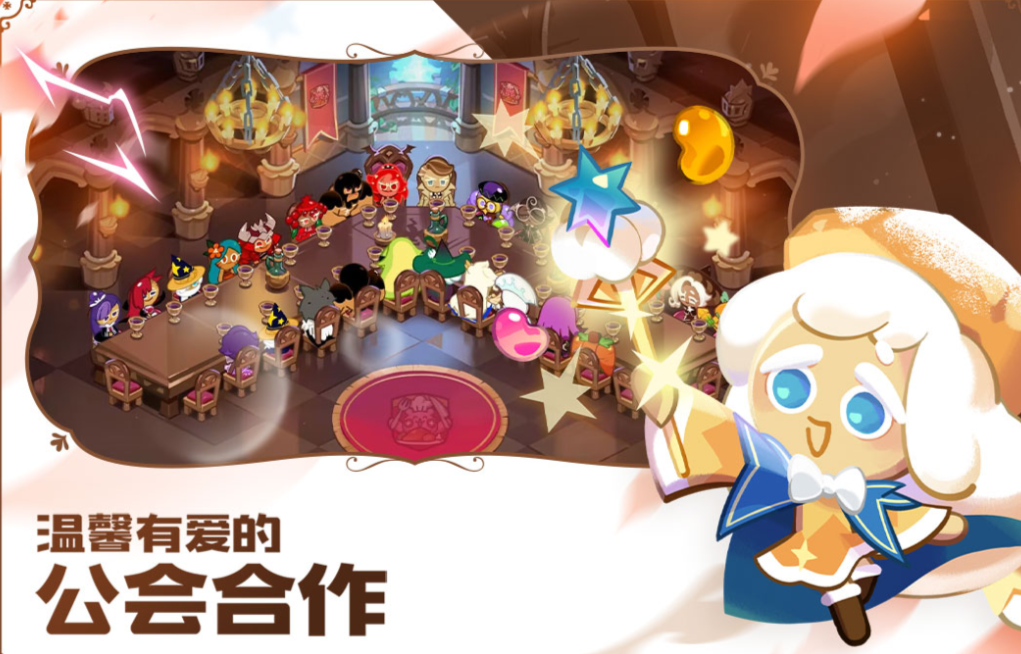 本作延续经典姜饼人IP设定,构建了一个温暖治愈的烘焙主题开放世界。玩家将扮演拥有独特技能的饼干居民,在王国中建设设施、派遣探险、抵御黑暗势力入侵,并与其他玩家协同完成日常委托。美术采用手绘质感与柔和光影结合的方式,营造出细腻温馨的沉浸氛围;任务系统轻量化但富有成长反馈,适配长时间轻度投入的休闲需求。
