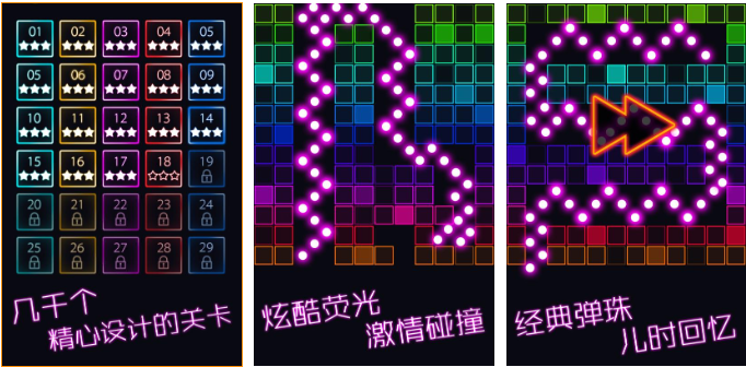 游戏提供超千关精心编排的挑战内容,融合经典弹珠规则与现代视觉语言。背景动态丰富,荧光粒子特效增强击打反馈,整体画面明快活泼。操作自由度高,支持自定义弹射路径与策略调整,兼顾怀旧情怀与当代审美需求。