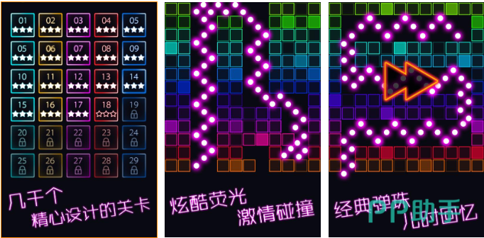 本作支持重力感应操控,玩家倾斜设备控制弹球发射角度与力度,实现方块消除。多种色块组合增强画面层次,3D环绕音效强化空间临场感,物理反射计算细致,整体视听表现均衡。玩法兼具策略性与操作感,还原经典弹珠机手感。