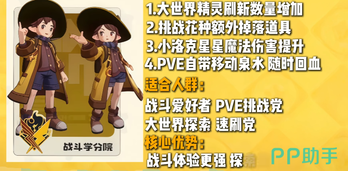 战斗学分院强化实战维度表现:野外精灵刷新频率更高,挑战特定区域花种时可获得额外资源加成,有助于加速精灵战力成长;同时具备野外自动恢复生命值机制,并搭载附带额外伤害的星星系魔法技能。整体设计倾向高强度对抗与快节奏推进,契合偏好PVE探索与策略对战的玩家需求。
