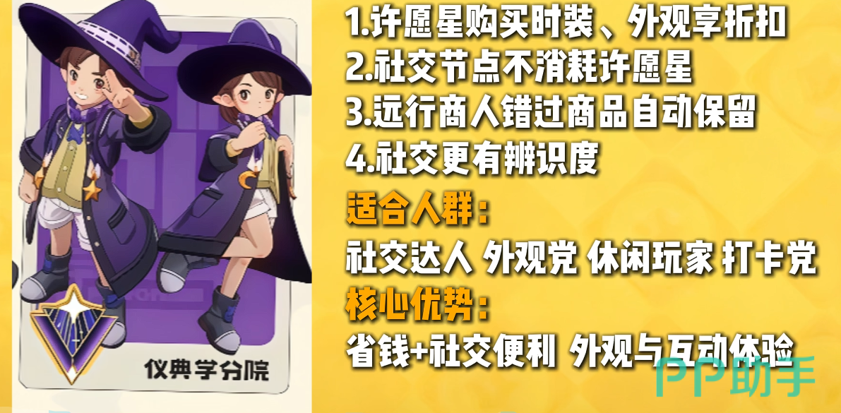 仪典学分院主打外观定制与社交体验优化,玩家通过许愿星兑换时装时可享受额外折扣,且在节日庆典、好友互动等社交场景中免收附加费用。该分院视觉风格鲜明,角色造型辨识度高,更适合注重个性化表达与社区协作的玩家群体。