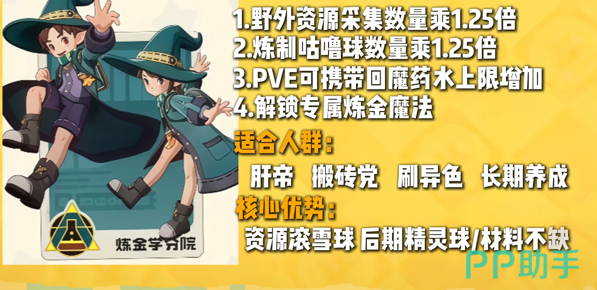 炼金学分院以资源转化效率为核心竞争力,其野外采集与精灵球炼制产出量为基准值的1.25倍,并配备专属炼金类魔法,支持道具定向合成。该分院属于中后期发力型路线——前期受限于材料储备不足,优势尚不明显;待进入资源富集阶段后,产能优势将全面释放,助力玩家快速完成装备升级与精灵进阶。