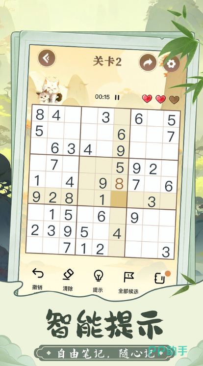 经典九宫格逻辑挑战,要求每行、每列及每个3×3小方块内均填入1至9且不重复的数字。题目设计严谨,容错率低,一次误填往往需整体回溯调整。但成功通关后的成就感极为强烈。界面支持多主题切换,关卡通关后可获得积分奖励,持续激励玩家深入挑战。