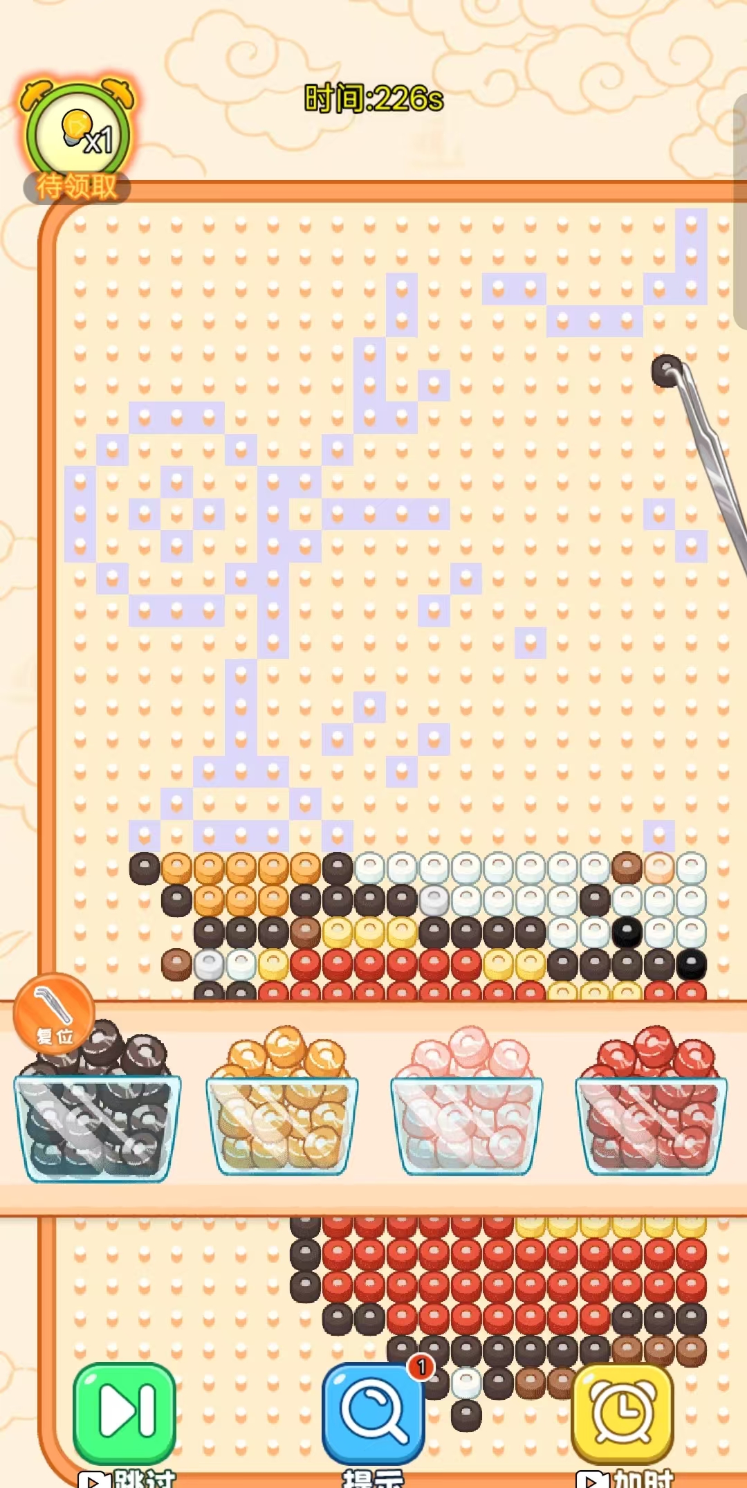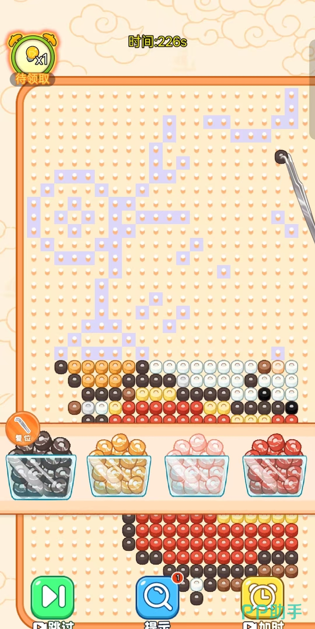 本作将线下热门手工活动“拼豆”数字化,打造低干扰、高专注度的治愈系玩法。玩家从数百种预设图案(含动漫角色、日常物品、几何图形等)中任选其一,使用虚拟镊子拾取对应颜色豆粒,在网格底板上逐颗摆放。完成后启用“熨烫”功能,画面呈现热压定型效果,最终生成一枚可收藏的像素风格挂件。全程无广告打断,无体力限制,强调过程沉浸与成果满足感。