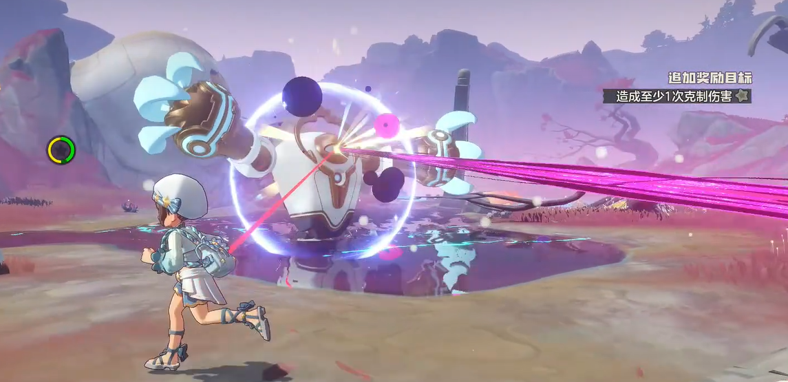 首阶段为纯玩家走位对抗环节,共存在两种判定清晰的攻击模式:其一为索敌锁定技,表现为红色连线持续约1.5秒后发动直线弹道射击,规避方式为保持中速横向绕圈移动,避免直线静止停留;其二为延迟落点型范围技,地面提前浮现明黄色圆形预警区,留有充足反应时间,只需在预警出现后立即脱离标记区域即可完全规避。