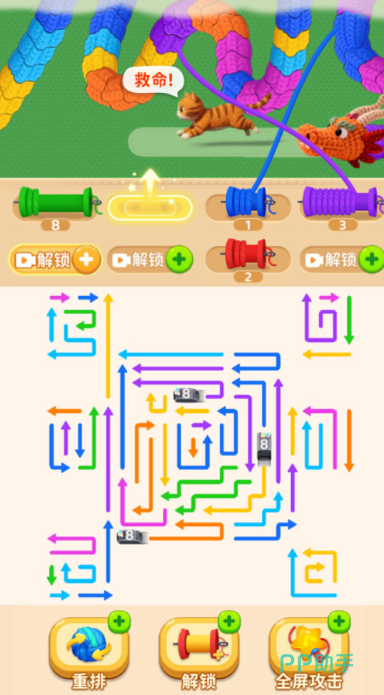 每局游戏都是一场微型战术推演。棋盘实时演化,箭头方向决定弹药类型与攻击轨迹;上方巨龙正沿固定路径向守护目标猫咪持续推进。你的每一次滑动不仅影响当前弹药生成效率,更直接关联最终防御成败。滑动幅度与节奏越精准,连锁反应越高效,击退威胁的成功率也越高——手脑协同的紧凑节奏,让玩家沉浸其中难以抽离。
