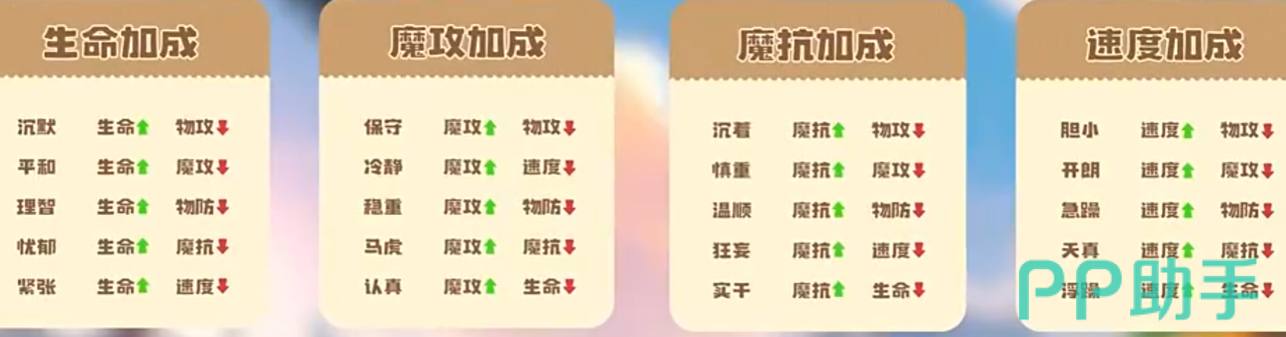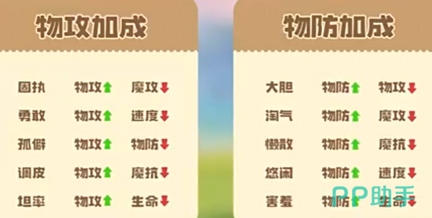 具体数值影响详见上方性格对照图。玩家在培养前需明确精灵主输出路径——若以物理攻击为核心输出手段,则应优先选择提升物攻的性格;若侧重站场生存,则需匹配增强防御类属性的性格组合。例如:勇敢性格+10%物攻/-10%速度,适用于高力度低速型爆发精灵;孤僻性格+10%物攻/-10%物防,适合对抗以魔法输出为主的对手阵容;调皮性格+10%物攻/-10%魔抗,在魔攻环境密集的副本中需谨慎使用。