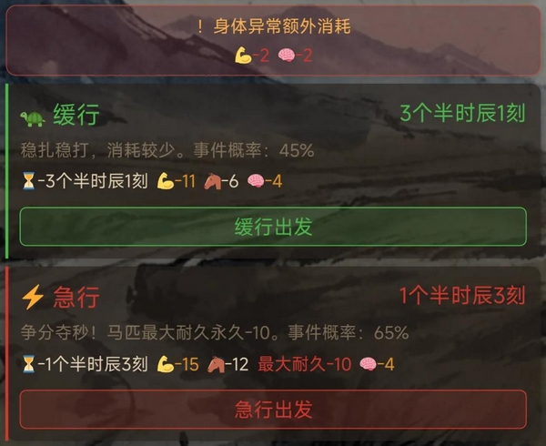 游戏采用高度动态的关卡结构设计:20座驿站对应20个独立决策节点,每次出发均会生成差异化事件链与遭遇组合,具备典型肉鸽(Roguelike)式随机性。玩家需在时间、体力、银钱、马匹耐力等多维资源间持续权衡,每一次驻足补给、绕路避险或正面突围,都将影响最终战局走向。